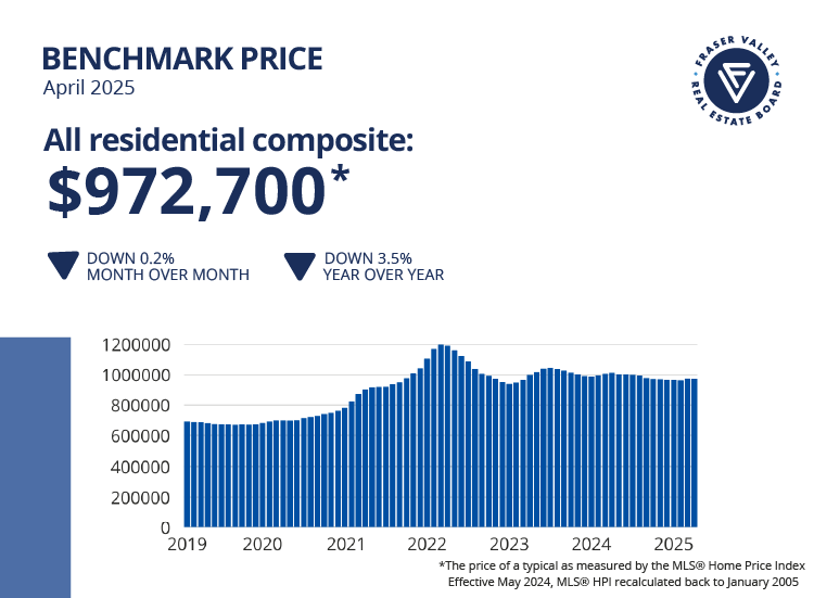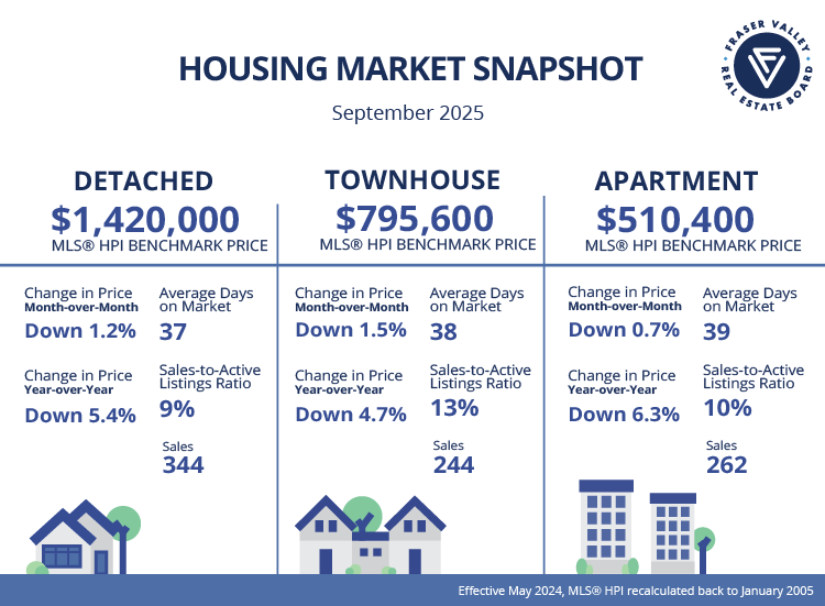 Apartments: At $506,400 the Benchmark price for an FVREB apartment/condo decreased 0.8 per cent compared to September 2025 and decreased 6.8 per cent compared to October 2024.